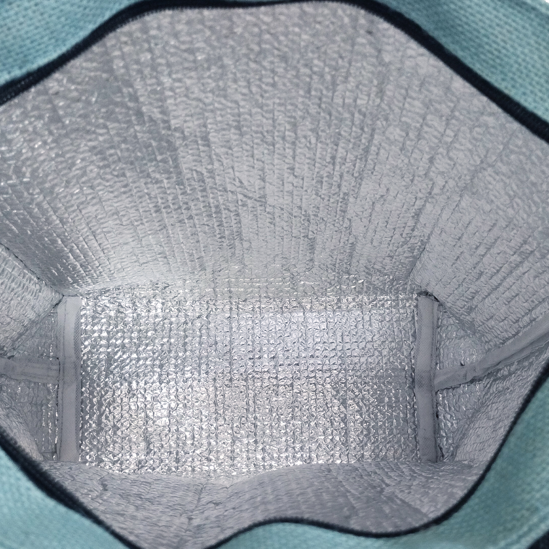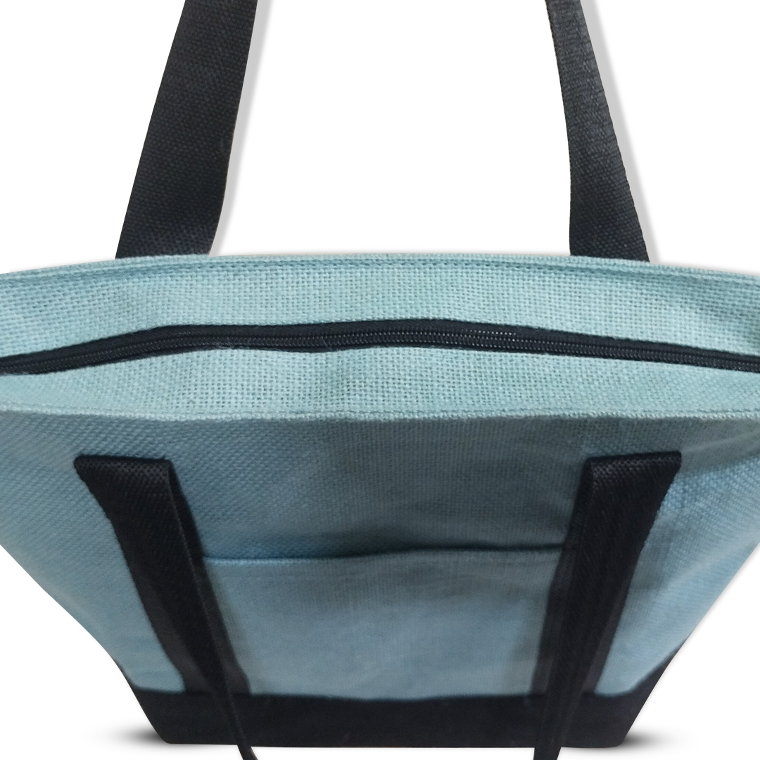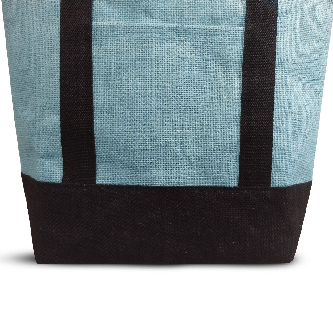 Other Details – Aqua blue insulated jute bag with black bottom and wrap around handle. Bag has a front pocket and a zip closure.