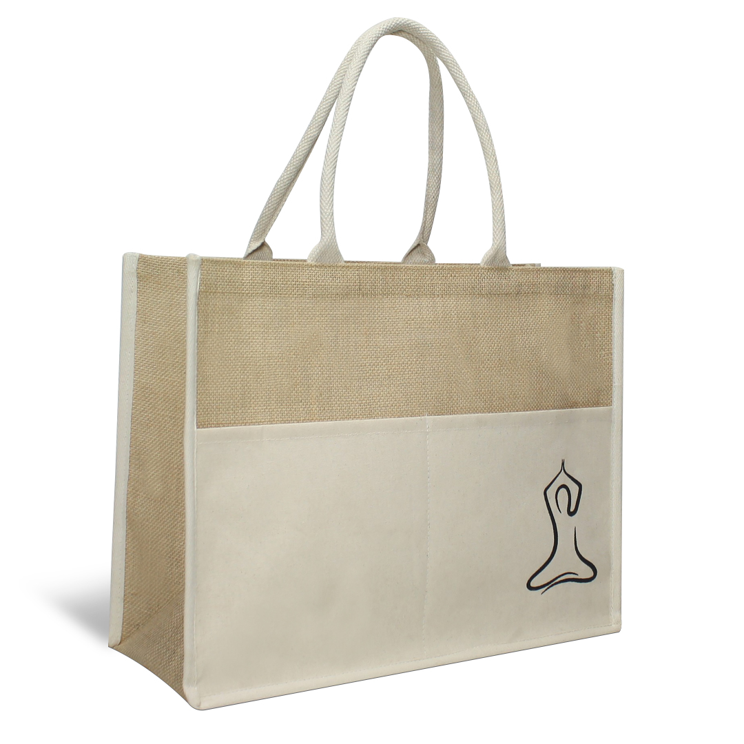 Other Details – Laminated jute bag with wide 8 oz canvas pocket on one side, cotton tape piping and 1.25″ x 22″ padded cotton webbing handles.