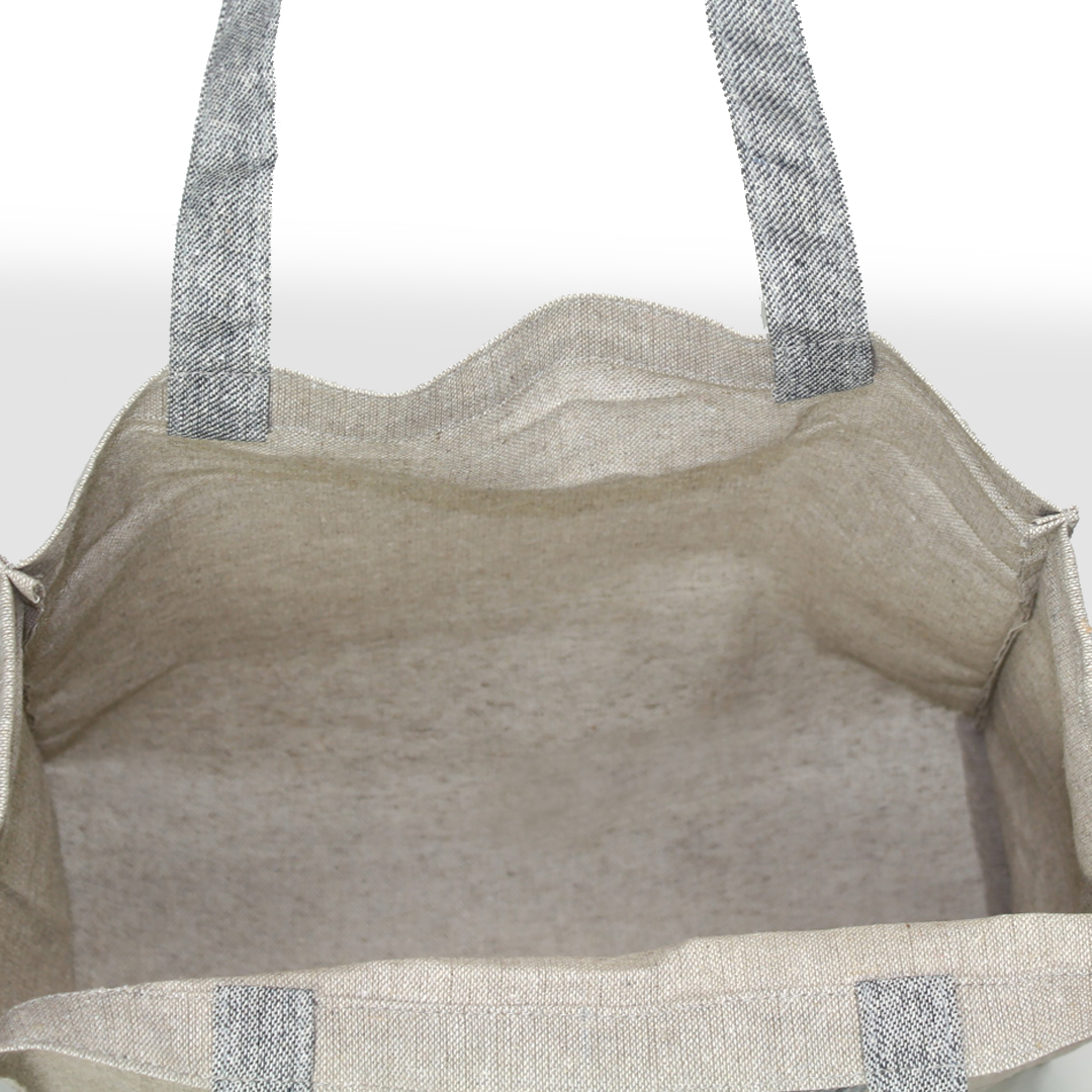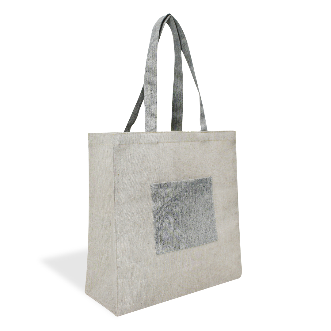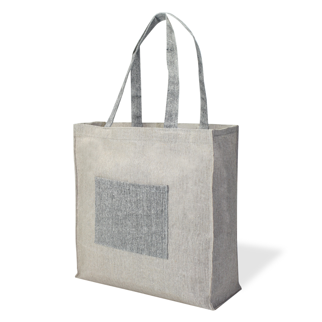 Other Details – 170 GSM recycled melange fabric (70% recycled Cotton + 30% Polyester) bag with pocket and handles in a darker shade fabric. The fabric is stiffened with starch and is not laminated with PP, so it can still stand on its own.
