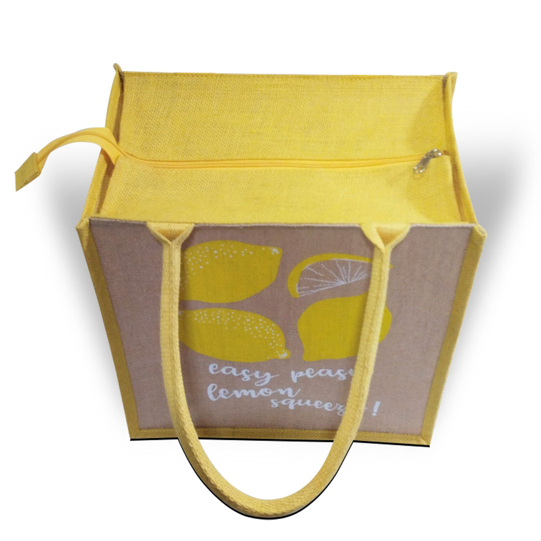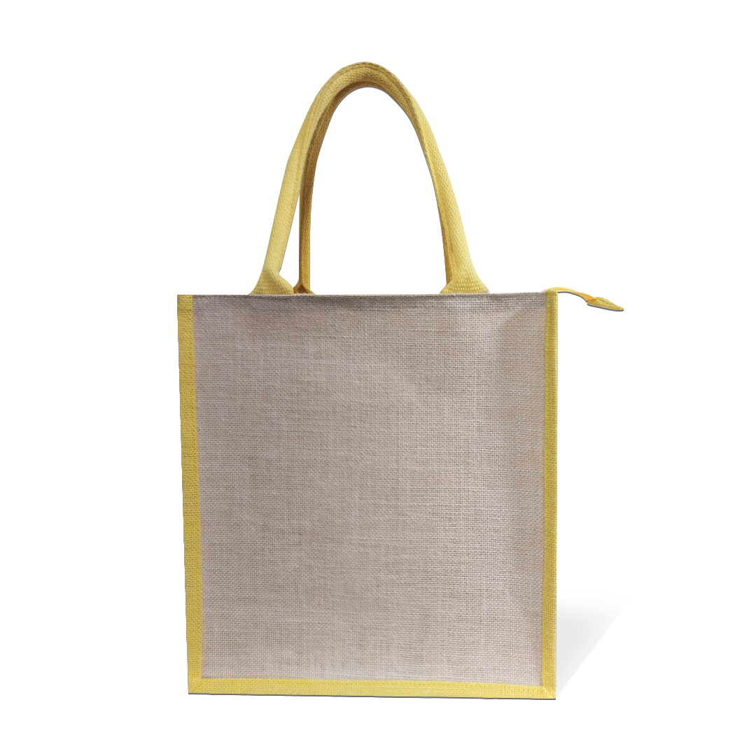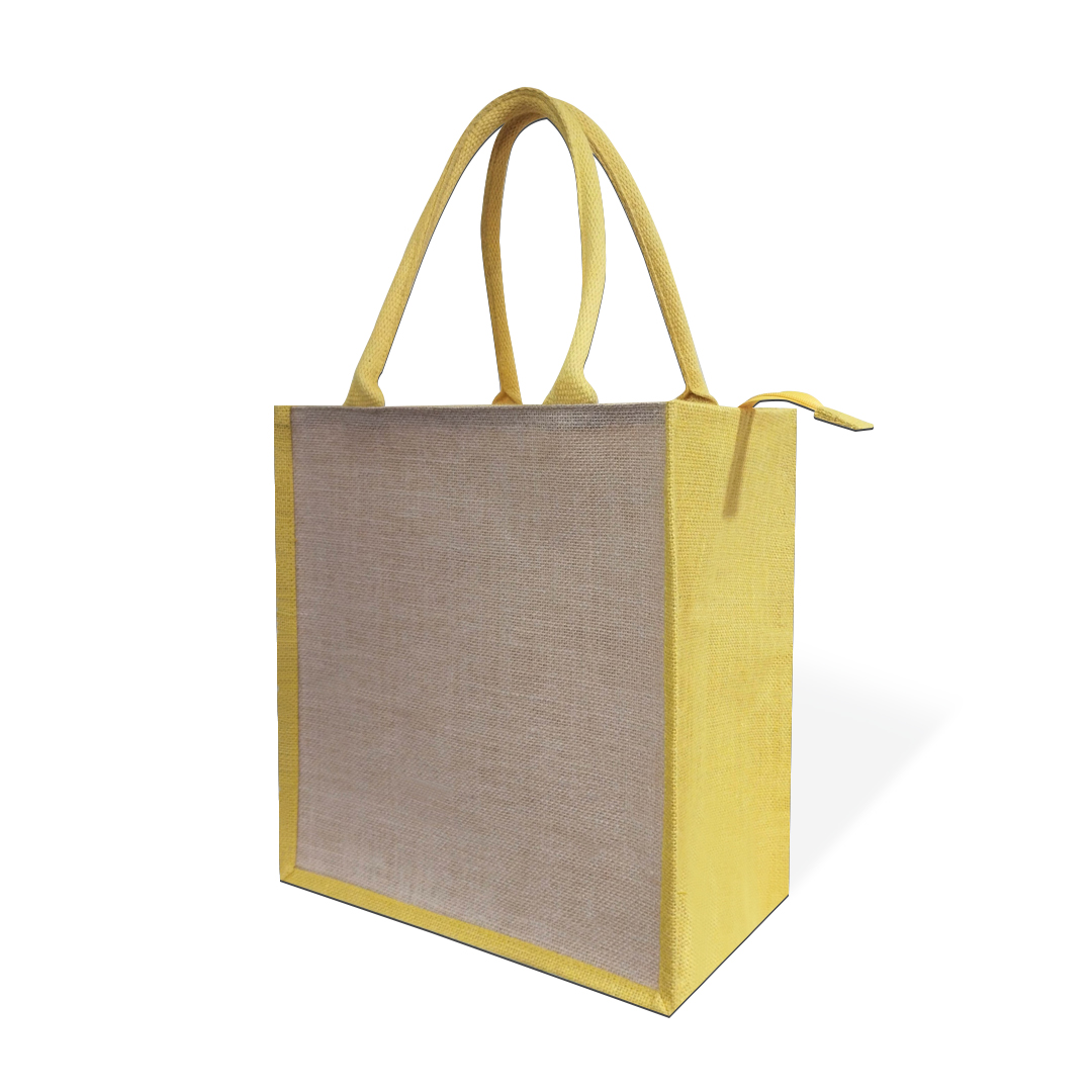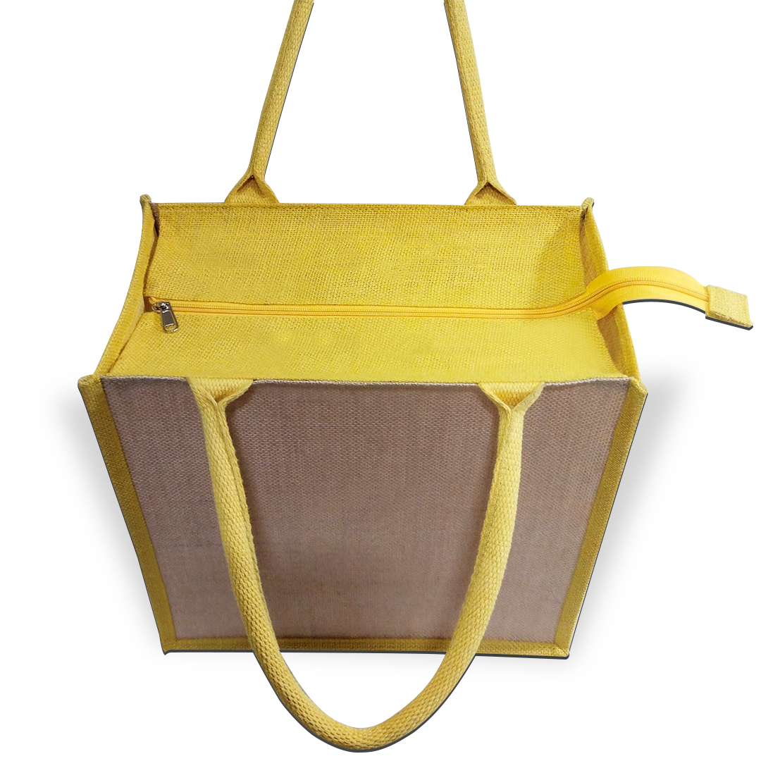 Other Details – Natural laminated jute bag with dyed laminated jute gusset. 1.25″ x 20″ padded cotton webbing handles and zip closure match the gusset.