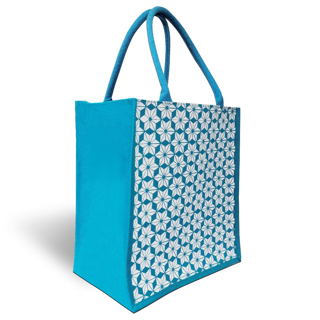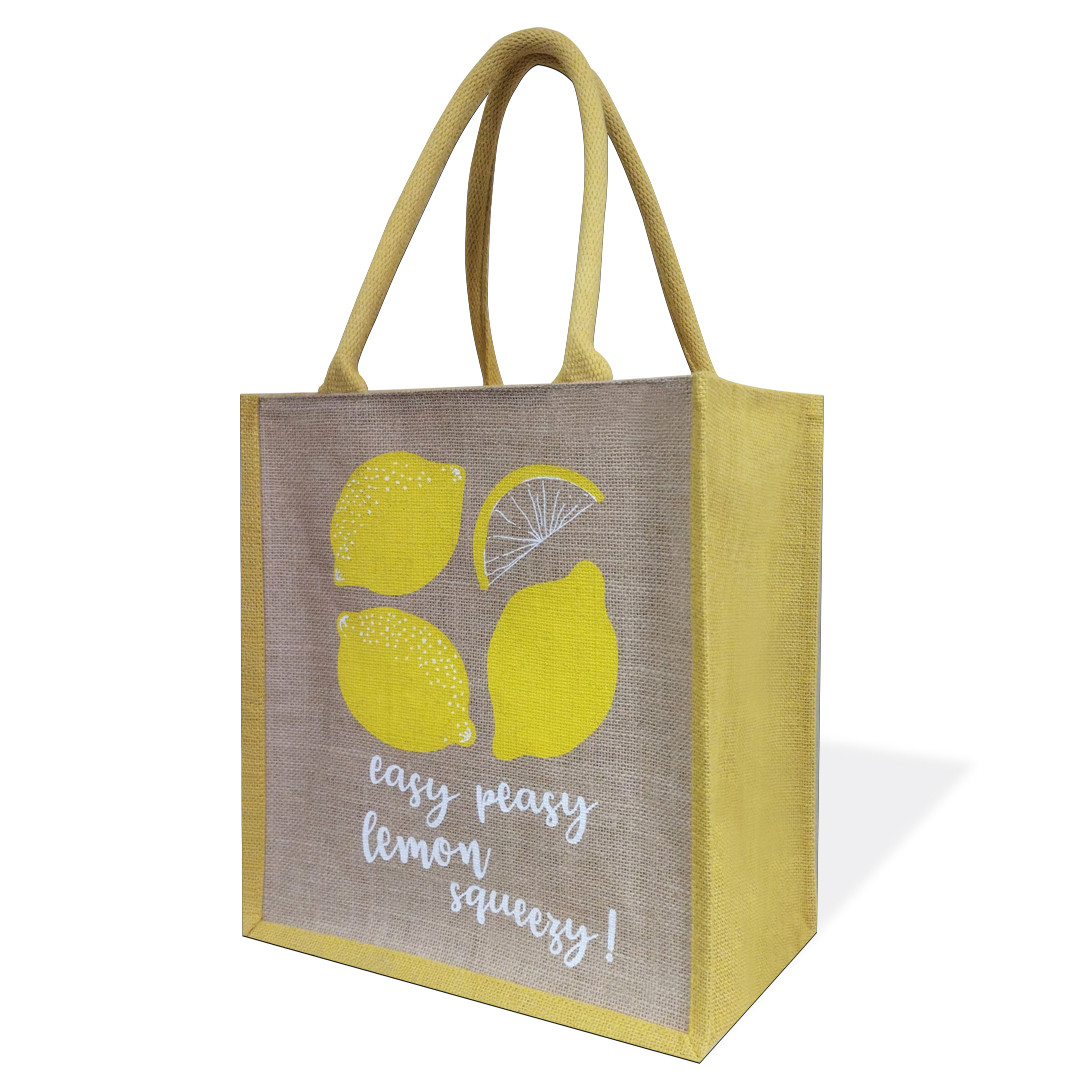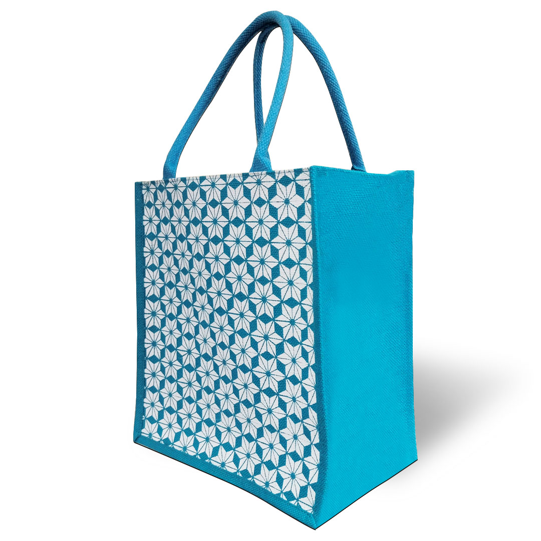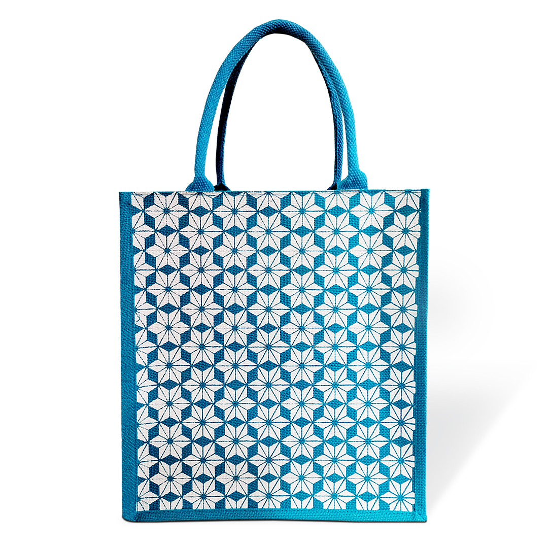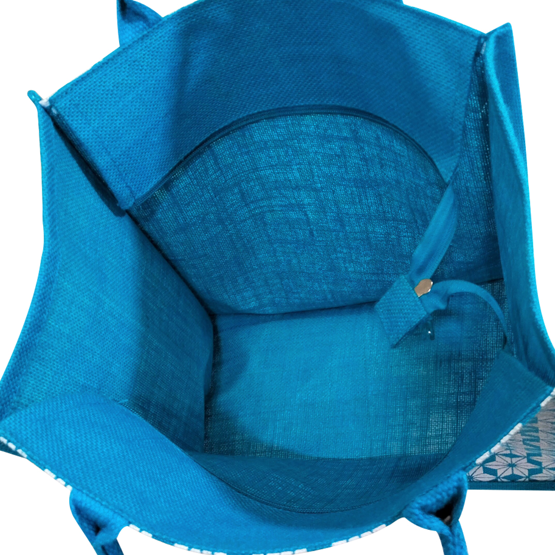 Other Details – Natural laminated jute bag with dyed laminated jute gusset. 1.25″ x 20″ padded cotton webbing handles and zip closure match the gusset.
