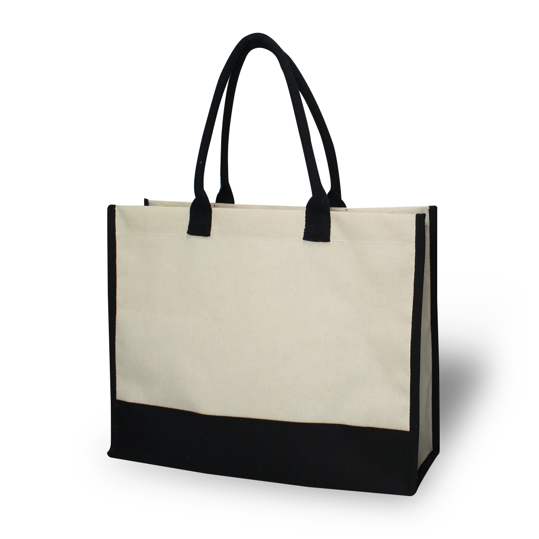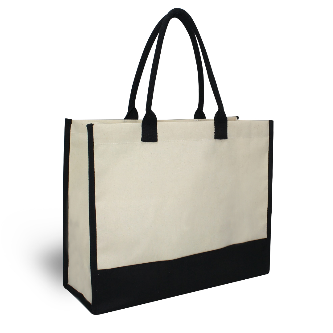 Other Details – 8 oz laminated natural canvas bags with bottom part, cotton piping and 1.25″ x 22″ cotton webbing handles dyed with a different color.