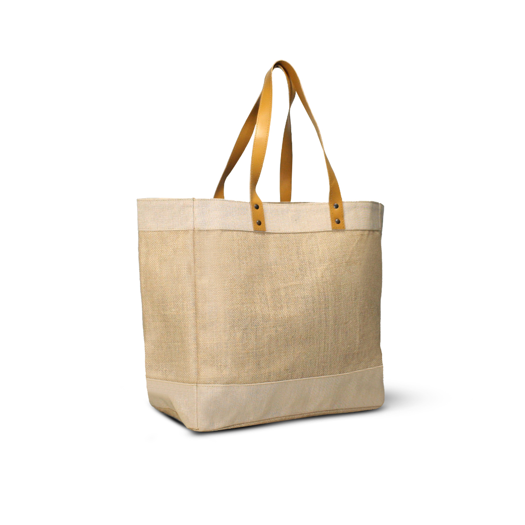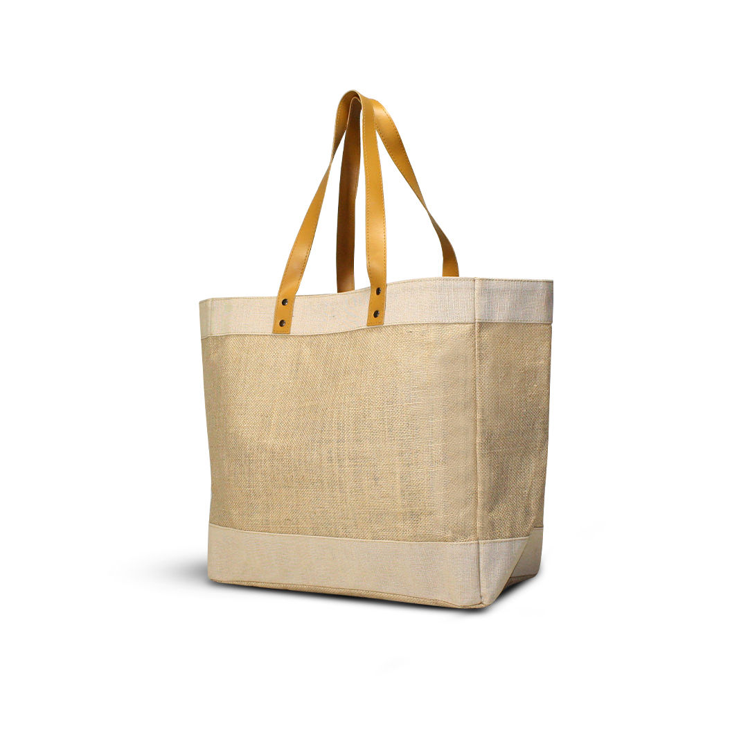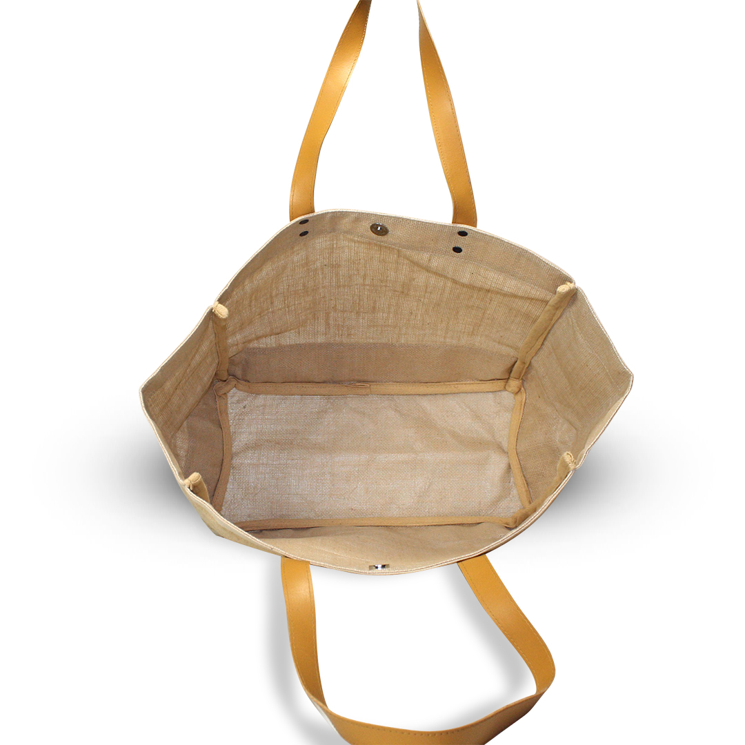 Other Details – Laminated Jute bag with top and bottom trim made of Laminated JUCO and features a magnetic closure. Bag has handles made of PU and fixed with silver studs.